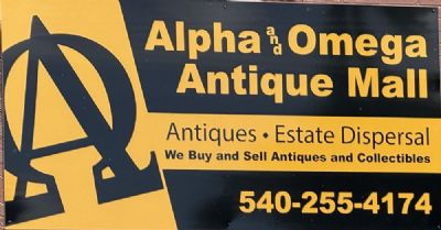 Alpha & Omega Antique Mall * Furniture * Prints * Paintings * Advertising * * Glassware * Pottery * Primitives * Jewelry * * Civil War Relics * Toys * Maps * Fossils * * Tools * Books * Mid Century * Quilts & Linens * * Stoneware * Baskets * Collectibles * * Architectural * Comics & Much More *
